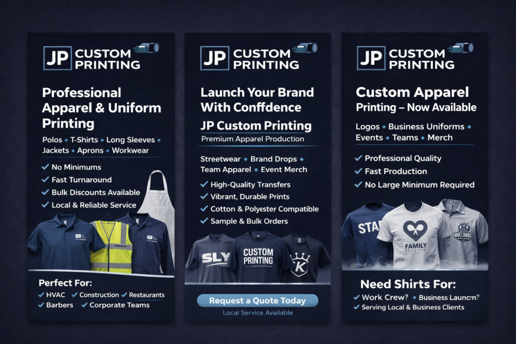 Are you an Artist , Brand Or Businees Owner Looking to create your own Brand Apparel, Business Uniforms , or team shirts and uniforms ? Reach out to JP Custom Printing Today to receive a Quote